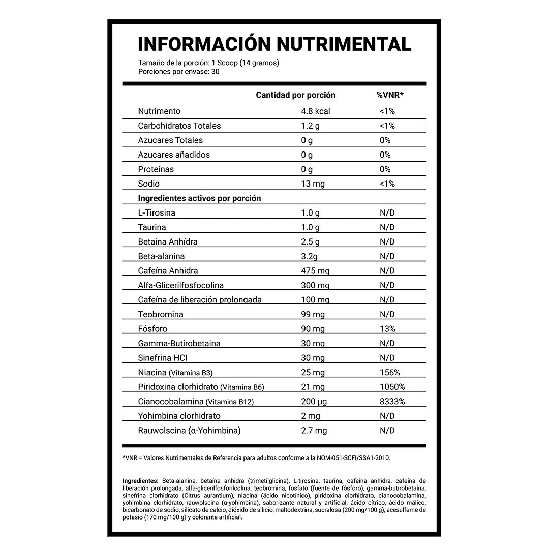 475 mg de cafeína total + estimulantes termogénicos de alta potencia. Fórmula para usuarios con experiencia avanzada en pre-entrenos. No recomendado para principiantes, sensibles a estimulantes, menores de 18 años, personas con condiciones cardiovasculares, hipertensión o en tratamiento médico. Evalúa tu tolerancia comenzando con media porción.